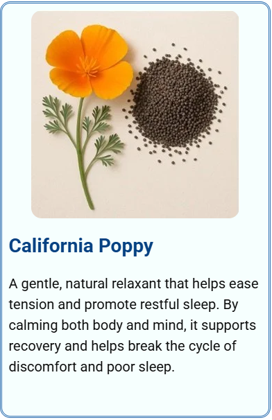 Includes calming botanicals that soothe the nervous system, helping break the cycle of nighttime discomfort and promoting deeper, more restorative sleep.